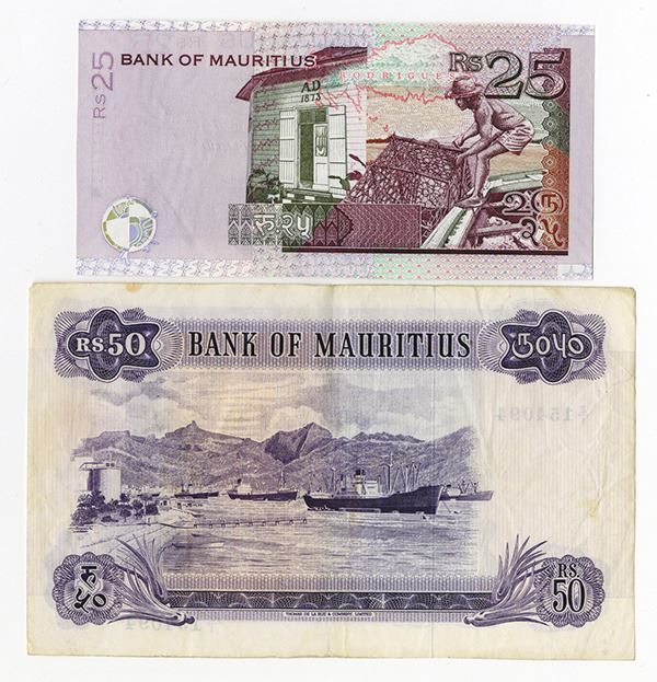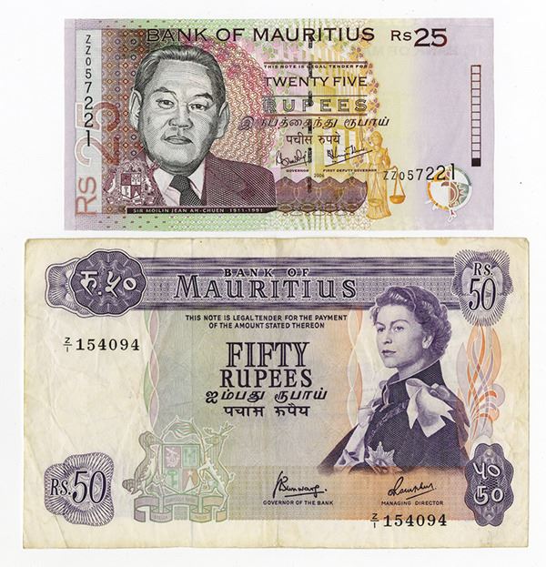 Mauritius, Lot of 2 notes, Includes ND 1967, 50 Rupees, P-33c, Replacement Banknote, Queen Elizabeth II at right, arms lower left, S/N Z/1 154094, Choice Fine to VF with small stains top margin and handling, but an original note; and, 2006, 25 Rupees, P-49c, AU-Unc., S/N ZZ057221. Attractive pair of Mauritius Replacement Notes. TDLR.