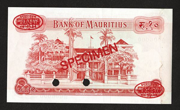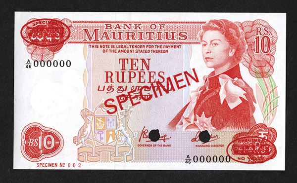 Mauritius. Pick #31c for the type. Unlisted as specimen. Signature combination #4. With DeLaRue oval stamp, numbered in lower left "Specimen No. 002". Punch hole canceled at signatures. Light evidence of previous mounting on back right edge Choice AU to Uncirculated condition. TDLR
