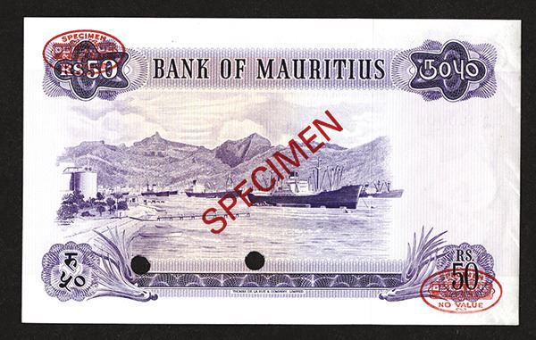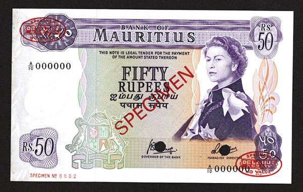 Mauritius. Pick #33c for the type. Unlisted as specimen. Signature combination #4. With DeLaRue oval stamp, numbered in lower left "Specimen No. 002". Punch hole canceled at signatures. Light evidence of previous mounting on back right edge Choice AU to Uncirculated condition. TDLR