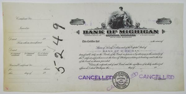 Detroit, Michigan, ND (1920-1950S). Odd Shares Progress Proof Capital Stock Certificate, No borders, Plate cancellation proof, Black text with Allegorical woman and child at top center. Cancelled stamps throughout. VF condition. RBNC.