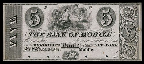 Mobile, Alabama, 18xx (ca.1830's), $5, Plate C, AL-45-Unlisted Design, Payable at the merchants Bank at the City of New York, Not listed in the census, Proof banknote, Banknote printed in black on india paper, Topless Allegorical woman seated with large cornucopia with gryphon, men handing her small cornucopia of coins on top middle, small sailing ship bottom middle, POC's, Very Small areas of glue staining from previous mounting otherwise, Uncirculated to Choice uncirculated condition, Rawdon, Wright & Hatch, New York imprint. (Silver City Collection, Part 2)