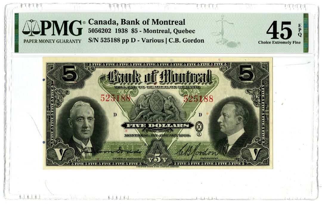 Canada. 1938. $5 - Montreal, Quebec, 5056202, Issued banknote, Black and green, S/N 525188 pp D - Various | C.B. Gordon, PMG graded Choice Extremely Fine 45 EPQ.