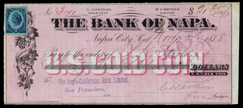 Bank of Napa, Draft Payable in U.S. Gold Coin.Napa City, California, $21,25, Issued draft or check, Black on pink underprint, Grapes on left counterfoil area with revenue stamp, signed by C.Hartson as president, XF condition. Scarce and attractive early wine growing region check.