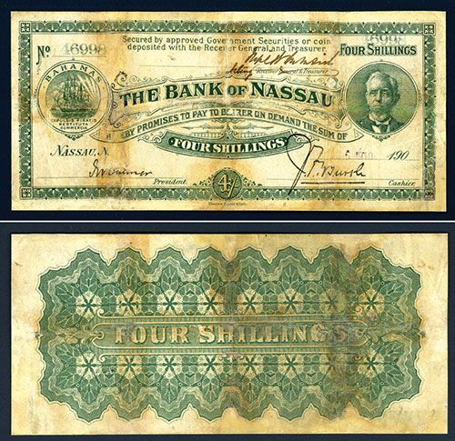 Nassau, Bahamas, (Jan?) 26, 1910, 4/- (Shillings), P-A8, Issued banknote, Unlisted date, Green, arms left, portrait of man right, S/N 46998, Appears Fine to Choice Fine but it has been repaired with small areas of added paper in spots and ink abrasion that has been repainted in small areas. Rare note in any condition and discovery date. CS&E.