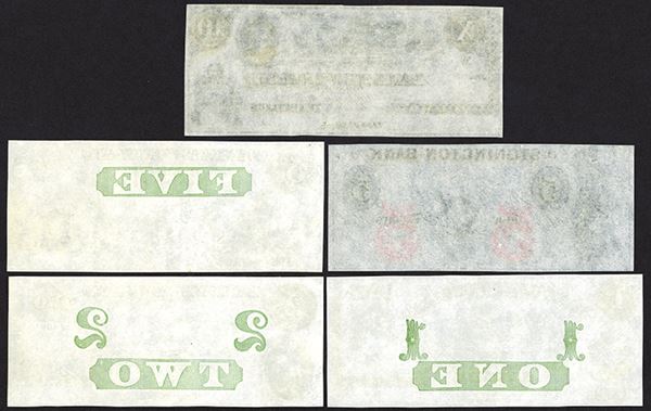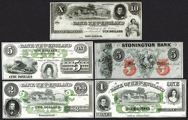 Bank of New England. 1, 2, 5, 10 Dollars; Stonington Bank. 5 Dollars. 18xx.