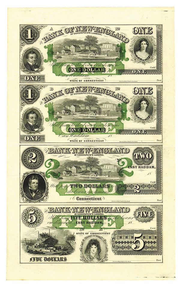 Sheet includes 1 Dollar, 1 Dollar, 2 Dollars, and 5 Dollars, unissued, unnumbered, and unsigned. About Uncirculated. ABNC.