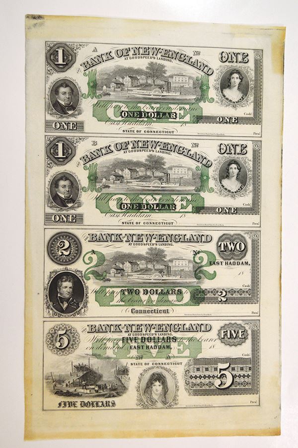 CT. $1-1-2-5. Paddle-wheel steam boat at top center passing Goodspeed's Landing on first three, shipbuilding yard on last. ABNC. Uncirculated.