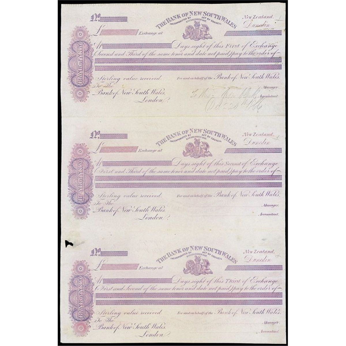 Dunedin. New Zealand. ND (1866 written in pencil top exchange). Uncut sheet of 3 proof 1st, 2nd and 3rd Bills of Exchange printed in purple. Correspondent bank in London, England. Printed on thick india type of paper. Vignette of lions, unicorn and crown in middle and counterfoil of bank title on left. All are in VF to XF condition with minor toning, wrinkling and glue stains. Printed by Perkins, Bacon & Co., London. PBC. Rare early New Zealand fiscal item from scarce location.