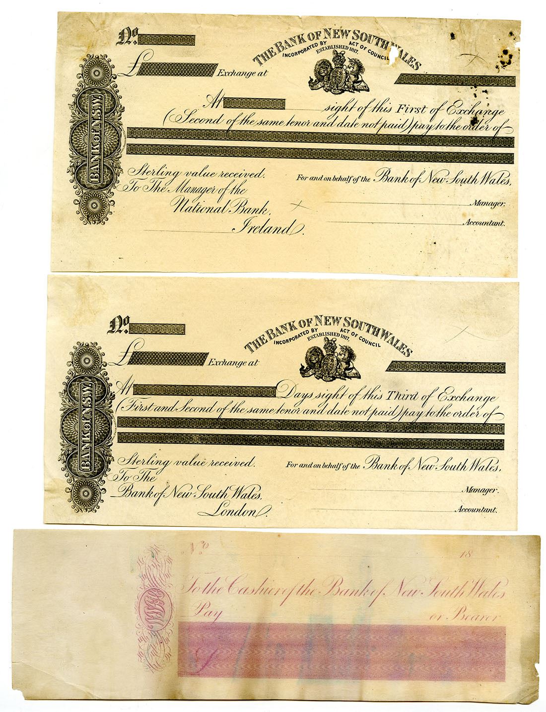 New South Wales, Australia. Lot includes 3 pieces: 9.5 x 5 inch Proof First Exchange draft payable at , Black text, Royal Coat of Arms of the United Kingdom at top center, Fine condition he National Bank of Ireland with staining and small hole near company name; Matching 9.5 x 5 inch Third Exchange payable at the Bank of New South Wales in XF condition with some staining at left margin; and a 10.5 x 3.5 inch Proof check, Pink text with pink undertint, company logo at left, Fine condition with damage to margins as well as some staining. 3 pieces. The Bank of New South Wales (BNSW), also known commonly as The Wales, was the first bank in Australia, being established in Sydney in 1817 and situated on Broadway. During the 19th century, the bank opened branches throughout Australia and New Zealand, expanding into Oceania in the 20th century. It merged with many other financial institutions, finally merging with the Commercial Bank of Australia in 1982, and was renamed to the Westpac Banking Corporation later that year. (3)