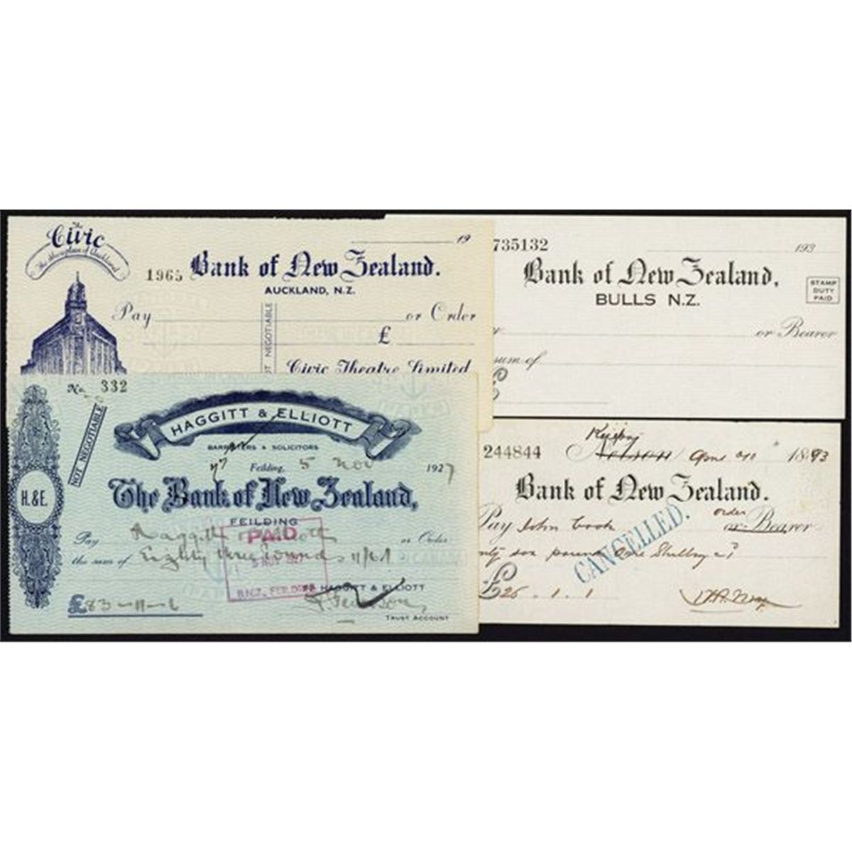 New Zealand, Lot of 4 checks, Includes 1893 Bank of NZ with Maori warrior and mountain in background on left and 193x unissued check of similar design. Also includes Haggitt & Elliot, Fielding, 1927 and Unissued Auckland, Civic Theatre Ltd check sample. All are in VF to XF.