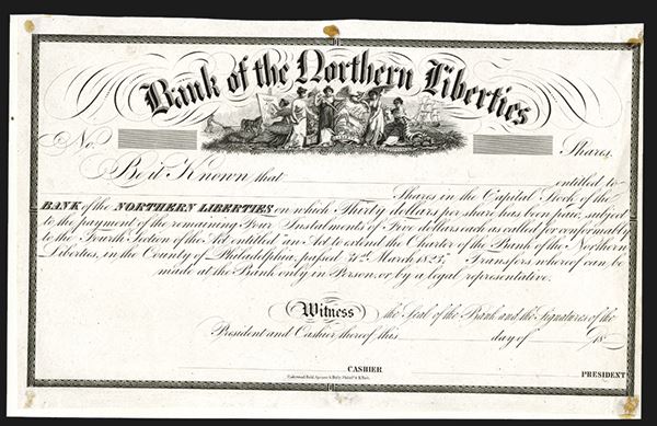 Philadelphia, Pennsylvania, Odd Shares, Allegorical women with Pennsylvania arms under curved title, printed on india paper on thin card, VF-XF condition with light glue spots in excess margin, UBSH.
