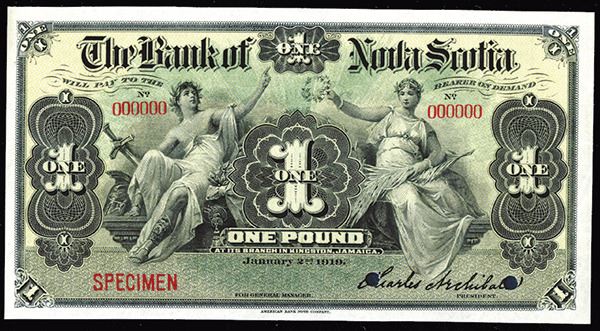 Kingston, Jamaica (Canada), £1, P-S131s, 550380204S, Specimen, Black on olive green and light yellow, Allegorical man and woman flank denomination counter, back green, Specimen and "000000" overprints, POC's, PMG graded Choice Uncirculated 64 EPQ. Very attractive and scarce note. ABNC.