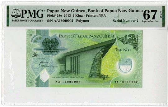 Papua New Guinea, 2013. 2 Kina, P-28c, Issued Polymer banknote, Green on green, blue and yellow underprint, Very Low Serial Number 2 (S/N AA13-000002), Polymer, PMG graded Superb Gem Uncirculated 67 EPQ. Printer: NPA.