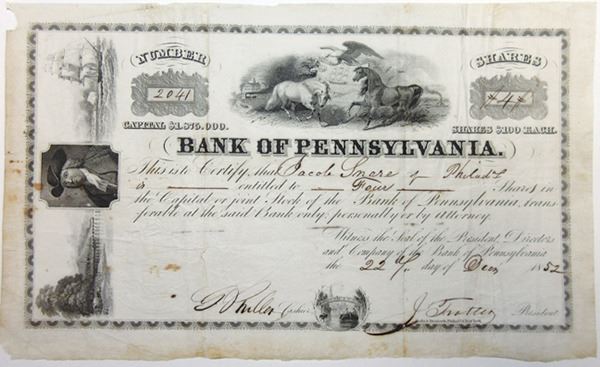 Pennsylvania. 4 Shares, I/U. Five bank note quality engraved vignettes of Pennsylvania arms with Horses, William Penn, train, ships, canal boat. Small pieces out of the left margin, minor foxing, otherwise VF, by Hufty & Danforth. Rare certificate.