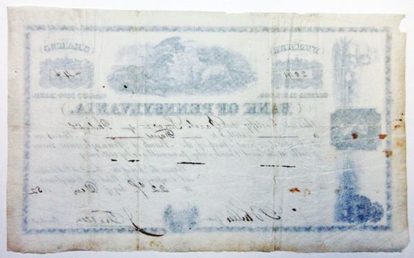 Pennsylvania. 4 Shares, I/U. Five bank note quality engraved vignettes of Pennsylvania arms with Horses, William Penn, train, ships, canal boat. Small pieces out of the left margin, minor foxing, otherwise VF, by Hufty & Danforth. Rare banknote.