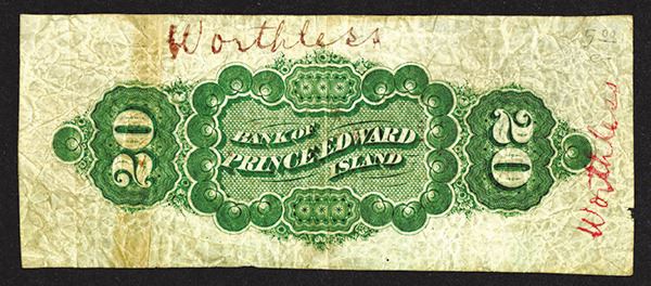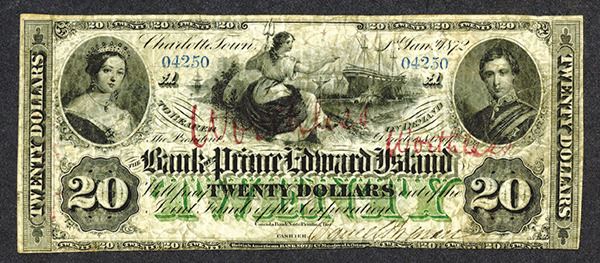 Canada. 20 Dollars. P-S1931a. Victoria and Prince Albert in two corners. With red ink text Worthless repeated twice on each side. Very Good, crumpled in the past.