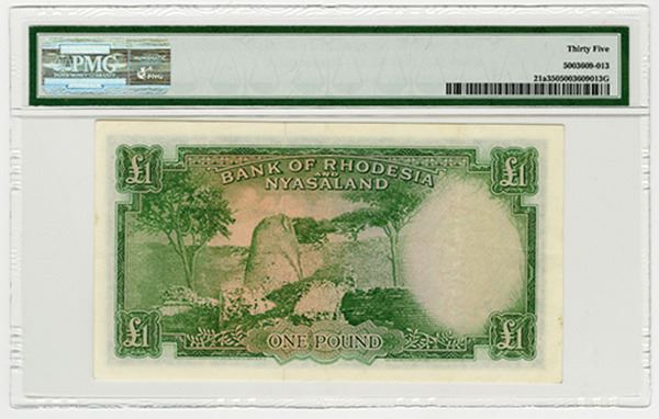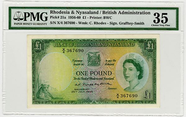 Rhodesia & Nyasaland. Issued 1 Pound, 1956, P-21a. PMG graded Choice Very Fine 35 (Cert # 5003609-013). BWC.