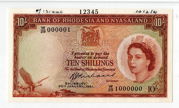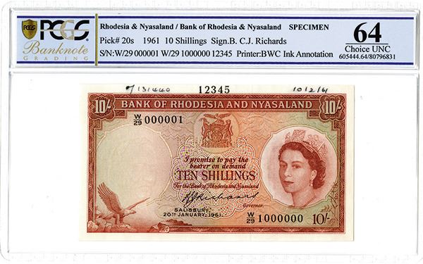 Rhodesia & Nyasaland, 10/- Shillings, P-20s, Specimen, Red brown on m/c, Queen Elizabeth II on right, back brown-red, PCGS graded Choice Uncirculated 64 with note of printer's annotation. S/N W/29 000001 - W/29 1000000, BWC. Scarce in this high of grade.