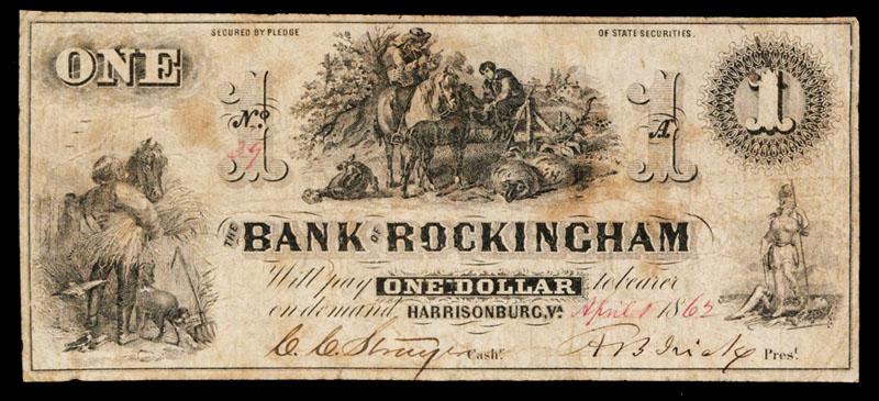 Bank of Rockingham Obsolete Banknote.Harrisonburg, VA, 1862, $1, VA-100-G10, Issued banknote, Farmer with sheaves on left with horse and dog, Liberty killing tyranny on right and man on horse smoking pipe with sheep and boy on fence in middle, S/N 39, Fine to Choice Fine condition, no printers imprint. (Round Mountain Collection, Part 1).