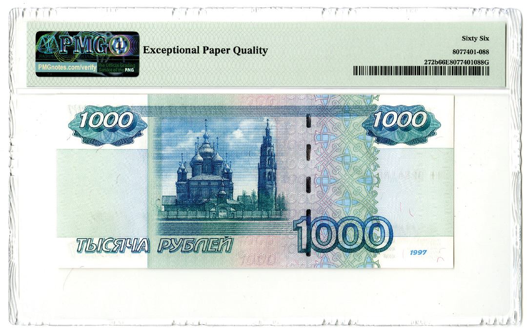 Russian Federation. 1997/2004. 1000 Rubles, P-272b, Issued banknote, Multicolor, S/N KV9224188, Watermark: Prince Yaroslav the Wise, PMG graded Gem Uncirculated 66 EPQ. Printer: Goznak.