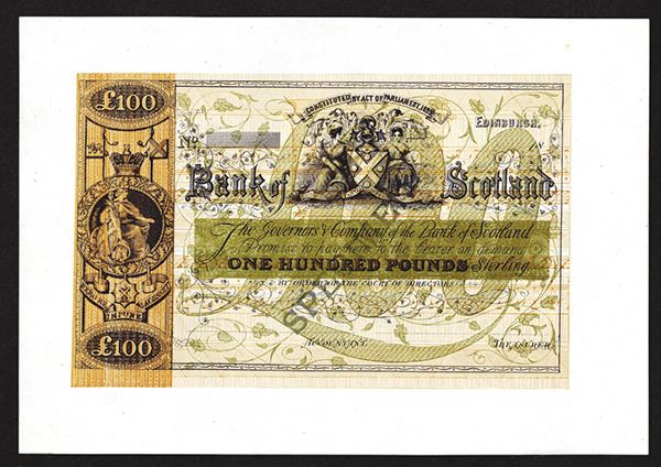 Scotland. 100 Pounds. Unlisted in the SCWPM. Scottish arms at top center with female supporters, female seated at left end with Scottish shield, palm and cornucopia. Black with two-tone-tan and olive-green underprint. Generous margins. Lithographed. Uniface as made, overprint SPECIMEN. Uncirculated and very nice.