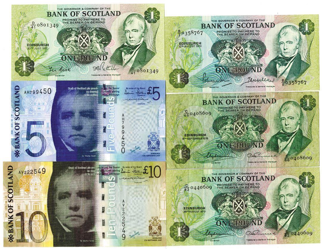 Scotland.... Bank of Scotland Group of Issued notes Includes, 1 Pound, 1970-1981, P-111a (1) P-111c (2) P-111e, Green on m/c underprint, arms at center flanked by two woman, Sir W Scott at right, back shows sailing ship at left, arms at upper center, medallion of Pallas seated at right; 5 Pounds, 2007, P-124a, Dark blue on m/c underprint, Sir Walter Scott at center, back shows Statue and Brig O'doon in south Ayrshire, TDLR; 10 Pounds, 2007, P-125a, Dark brown and deep olive green on m/c underprint, Sir Walter Scott at center, back shows Glenfinnan Viaduct and West Highlands, TDLR. Notes range from VF-Choice AU. (6). (Sold "AS IS", No returns accepted)
