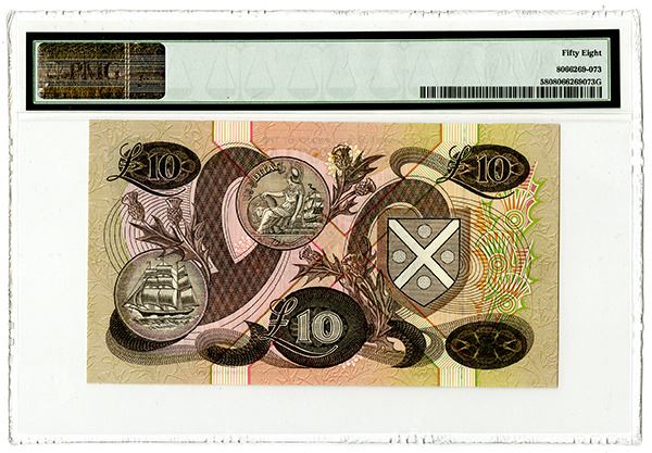 Edinburgh, Scotland. 10th October 1979, £10, P-Unlisted signature combination for the 1979 date, Lord Clydesmouir | D.B. Pattullo signatures only listed on the 1981 notes for this issue, not the 1979 issue. Discovery signature combination, S/N N767116, PMG graded Choice About Uncirculated 58.