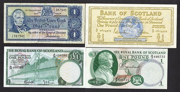 Scotland. 1 Pound notes. P-105b (electronic sorting bars); 169a 1968; 327a; 334a. First is Choice VF; second Very Fine; last two are Choice Uncirculated. 4 pieces.