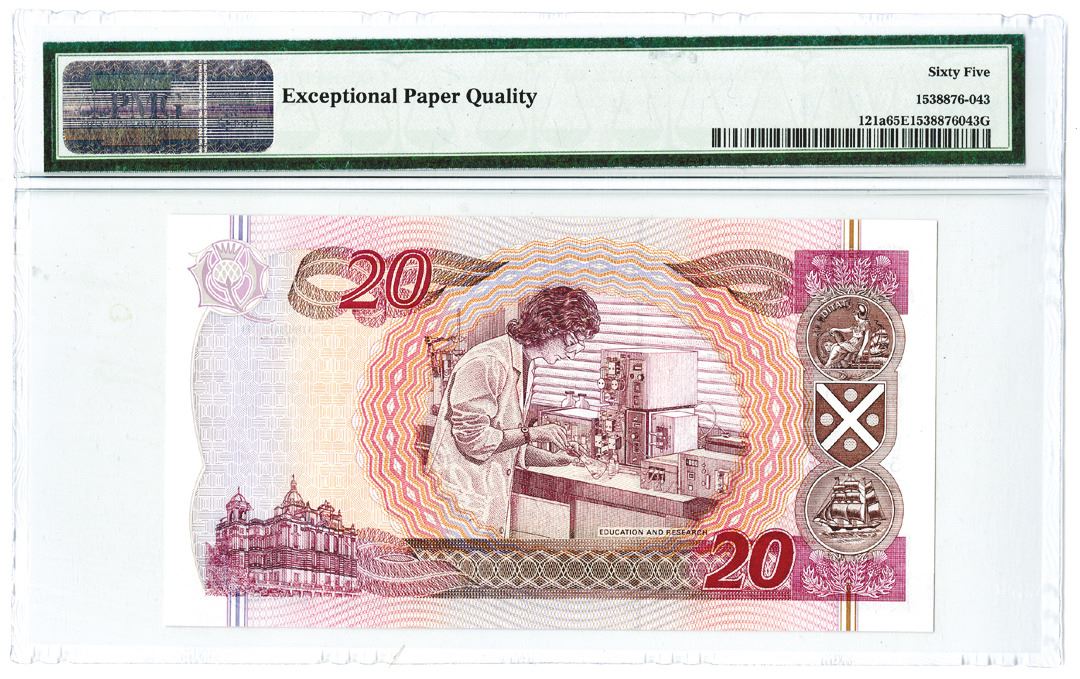Scotland. Bank of Scotland, 20 Pounds, 1995, P-121a, S/N AA001052, Violet and brown on m/c underprint, Sir Walter Scott at left, bank arms at center, back shows female researcher at laboratory station at center, bank head office building at lower left, PMG graded 65 Gem Unc EPQ, TDLR. (Arthur C. Matz Collection)