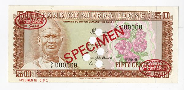Sierra Leone, 50 cents, P-4s, Specimen, Brown on m/c, President S.Stevens at left, Red Oval TDLR Specimen overprints on face and back. S/N D/9 000000, Serial #1, POC's, Rare as a specimen in this format. AU/Uncirculated with light mounting remnants on back right. TDLR. Unlisted as a specimen in SCWPM.