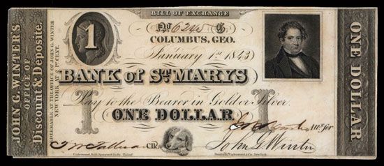 Columbus, Georgia, 1844, $1, Unissued, Issued banknote, ÒPayable in Gold or SilverÓ, Portrait of man on right and cameo Roman soldier with helmet and numeral 1 on top left, dog on bottom, There is a small hole due to ink burn of the signature and a couple of very small corner issues, but the note appears AU to Uncirculated, UBSH-DU.