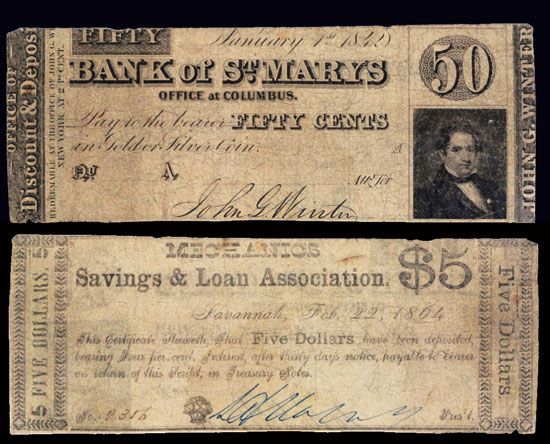 Columbus, Georgia, 1842, 50 cents, (GA-265?)unissued, cut close on margins that was reused in 1864 during the Civil War due to paper shortage for Mechanics S&L Association $5 Scrip note from Savannah, VG condition, scarce reuse of older note that is almost fully intact on back of 1864 note.