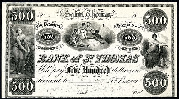 Bank of St.Thomas, 18xx (ca.1840-50's) Proof Banknote. Saint Thomas, DWI, $500, P-12 Reprint proof circa 1920's from original plate and included in the J. Wilcke book on Danish paper money. There is a small tear on the lower right that is archivally reinforced, otherwise the note appears Unc. to Choice Uncirculated, the bottom is cut into the bottom border and marks from old rust areas of the plate are slightly visible toward the middle and bottom of the note. This lovely note was engraved and printed by New England BNC. Rare note in any format and this is possibly the only way of obtaining an example of this DWI rarity.