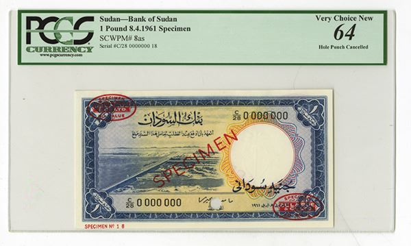 Sudan. 1961, 1 Pound, P-8as, Specimen Banknote, Specimen and Oval TDLR overprints on top left and lower right corners, Minor Mounting remnants on back right margin that is difficult to view. PCGS graded Very Choice New 64, POC, TDLR. Unlisted as a Specimen with TDLR overprints.