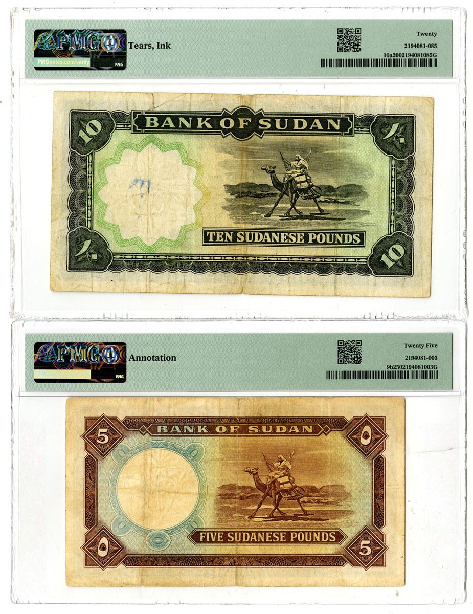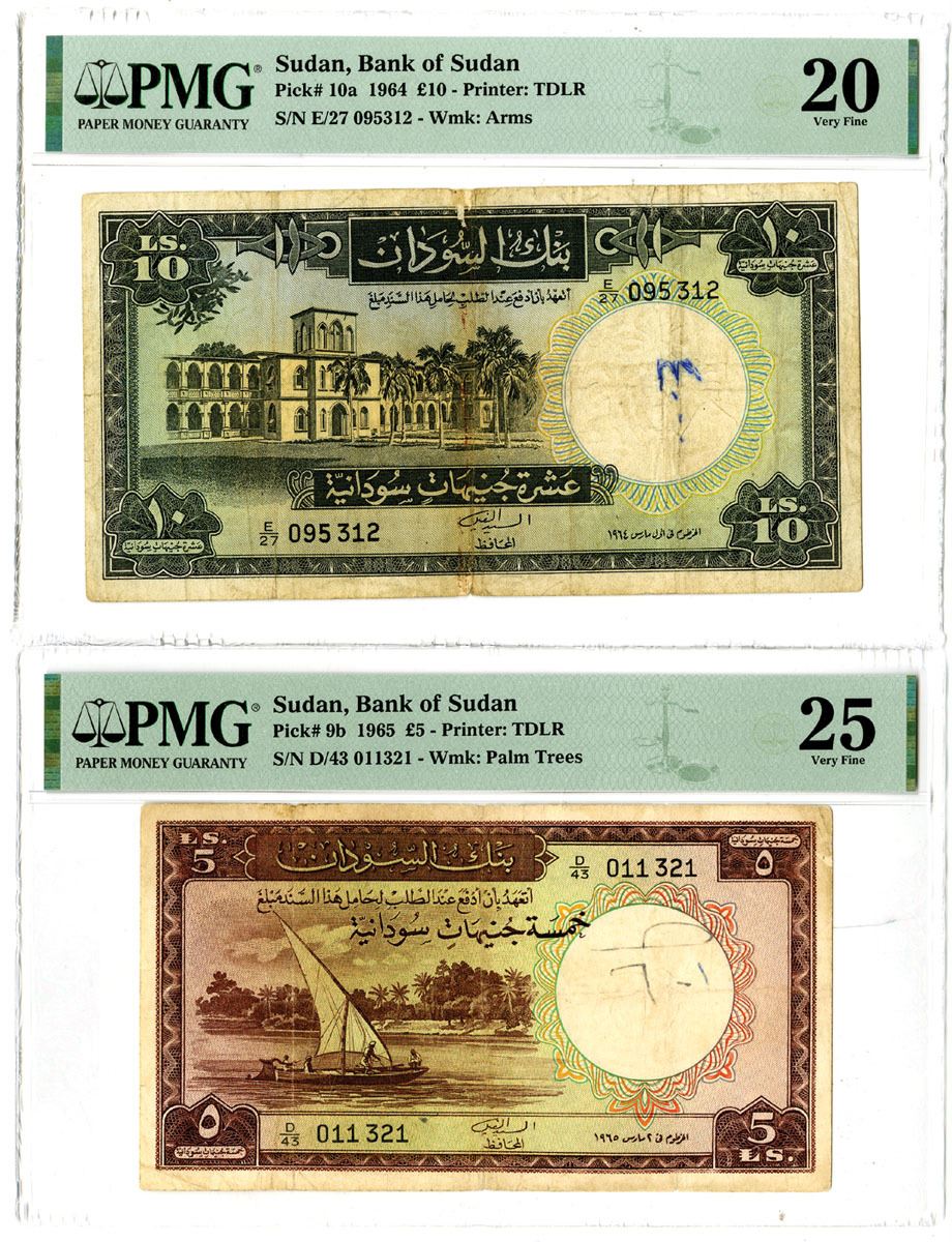 Sudan, 1964-65. Lot of 2 Issued Banknotes, Includes: 1965, 5 Pounds, P-9b, Lilac-brown on m/c underprint with Dhow at center, S/N D/43 011321, PMG Very Fine 25 with comment "Annotation"; and, 1964, 10 Pounds, P-10a, Gray-black on m/c underprint with Bank building at left, S/N E/27 095312, PMG Very Fine 20 with comments "Tears, Ink." Both printed by TDLR. (2). Sold "AS IS" no returns accepted.