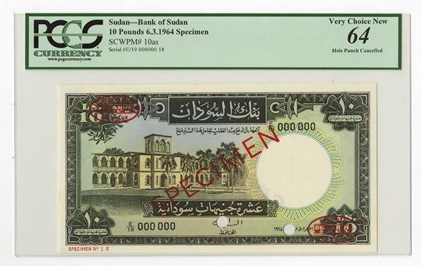 Sudan. 1964, 10 Pounds, P-10as, Specimen Banknote, Specimen and Oval TDLR overprints on top left and lower right corners, Minor Mounting remnants on back right margin that is difficult to view. PCGS graded Very Choice New 64, POC, TDLR.
