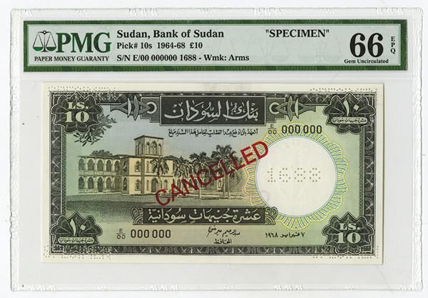 Sudan. Specimen 10 Pounds, 1968, P-10s, Specimen No. 1688 (perforated), CANCELLED overprint. PMG Gem Uncirculated EPQ.