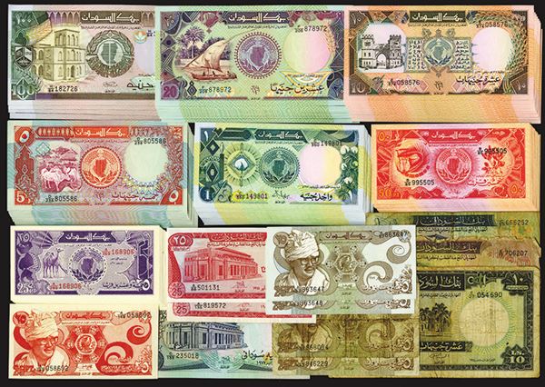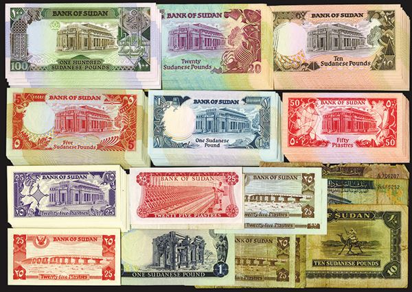 Sudan. 25, 50 Piastres, 1, 5, 10, 20, 100 Pounds. P-11; 13; 16 (2); 23; 30 (14); 38 (15); 39 (28); 44b (4); 45(26); 46 (10); 47 (9); All Uncirculated or very nearly so. Included are 9 other Sudan lots of low grade. 120 pieces total.