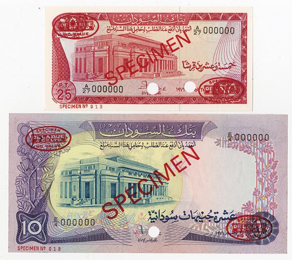 Sudan. Lot includes specimen 10 Pounds, 1971, P-15bs, Specimen No. 013, TDLR oval overprints, Uncirculated with very faint mounting remnants; and 25 Piastres, 1972, P-11as; Specimen No. 013, TDLR oval overprints, Gem Uncirculated.