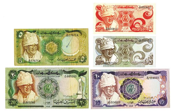 Sudan. Lot includes 25 Piastres, 1981, P-16; 25 Piastres, 1983, P-23; 5 Pounds, 1983, P-26; 10 Pounds, 1983, P-27; and 20 Pounds, 1983, P-28. First two Unc, the rest Fine to VF.