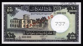 1966. 10 Pounds, P-10b, Unlisted Specimen banknote. Gray-black on m/c underprint with Bank of Sudan building on left, back black on m/c with soldier on camel on right. Red "Cancelled" overprints, black "000000" serial numbers and POC's. The note has pin punch "specimen" on all 4 corners. Uncirculated to CU condition. Rare banknote in any condition.