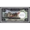 1967. 10 Pounds, P-10c, Unlisted Specimen banknote. Gray-black on m/c underprint with Bank of Sudan building on left, back black on m/c with soldier on camel on right. Red "Cancelled" overprints, black "000000" serial numbers and POC's. The note has pin punch "specimen" on all 4 corners. AU+ to Uncirculated condition due to archival handling on one corner but appears CU. Rare banknote in any condition.