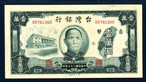 Taiwan, 1944. 10,000 Yuan, P-1944 (S/M#T72-23), Issued banknote, SYS at center, Dark Green, back m/c, PMG graded Choice About Uncirculated 58 NET with note of residue which is not visible, the note has one light corner fold on the upper right corner, otherwise this large margined, bright colored beauty would grade CU.
