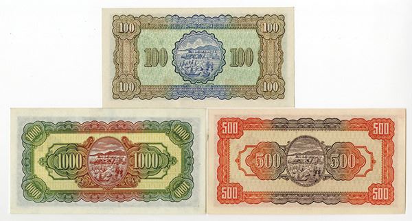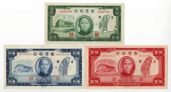 Taiwan, Lot of 9 notes, Includes 1947, 100 Yuan, P-1941, Issued, Green, (5); 1946, 500 Yuan, P-1940, Issued, Red, (3); and 1948, 1000 Yuan, P-1942, Issued, Blue, attractive group of notes mostly VF to AU condition.