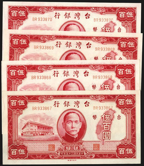 Taiwan, China. Lot of 4 sequential serial number 500 Yuan, P-1940 S/M#T72-6, Issued banknotes, Red with SYS at center flanked by building with small car in front on the left and map of Taiwan on the right, S/N's BR 933867 to BR 933870 , All are in Uncirculated to Gem Uncirculated condition. CPF