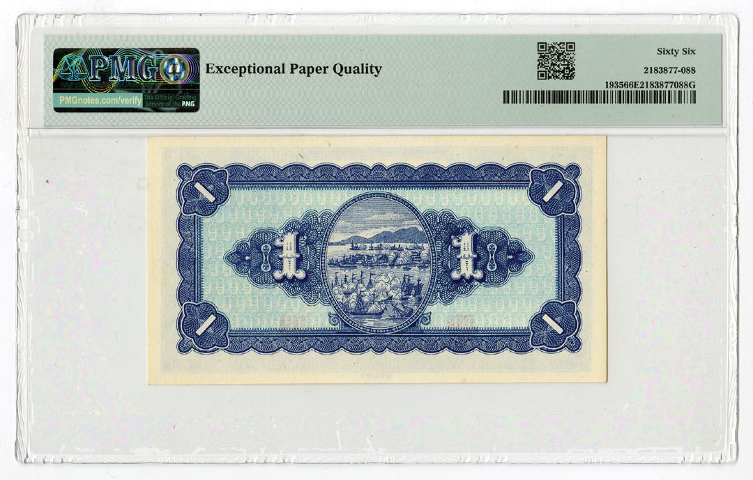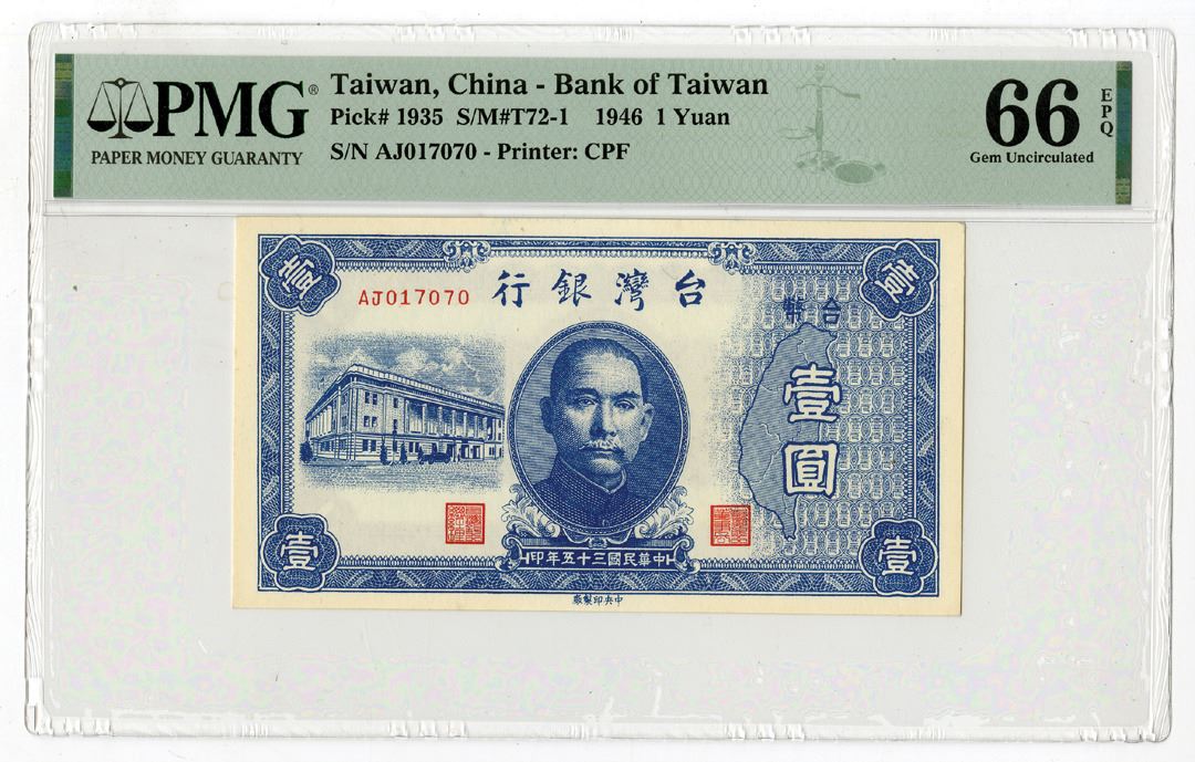 Taiwan, China, 1946. 1 Yuan, P-1935, S/M#T72-1, Issued Banknote, Blue printing, Bank building at left and map of Taiwan at right, SYS at center, S/N AJ017070, PMG graded Gem Uncirculated 66 EPQ, CPF.