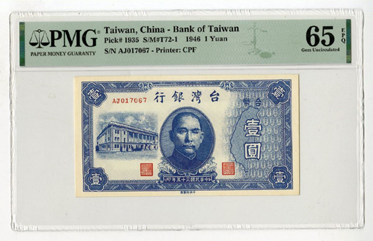 Taiwan, China, 1946. 1 Yuan, P-1935 S/M#T72-1, Issued Banknote, Blue printing with bank building at left, Island of Taiwan at right, and SYS at center, Back is blue, S/N AJ017067, PMG graded Gem Uncirculated 65 EPQ, CPF.