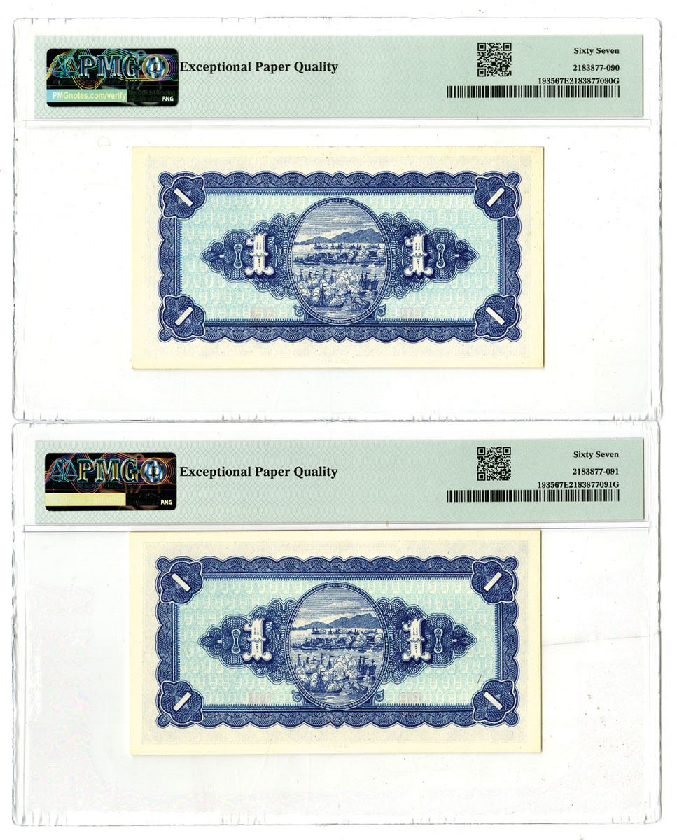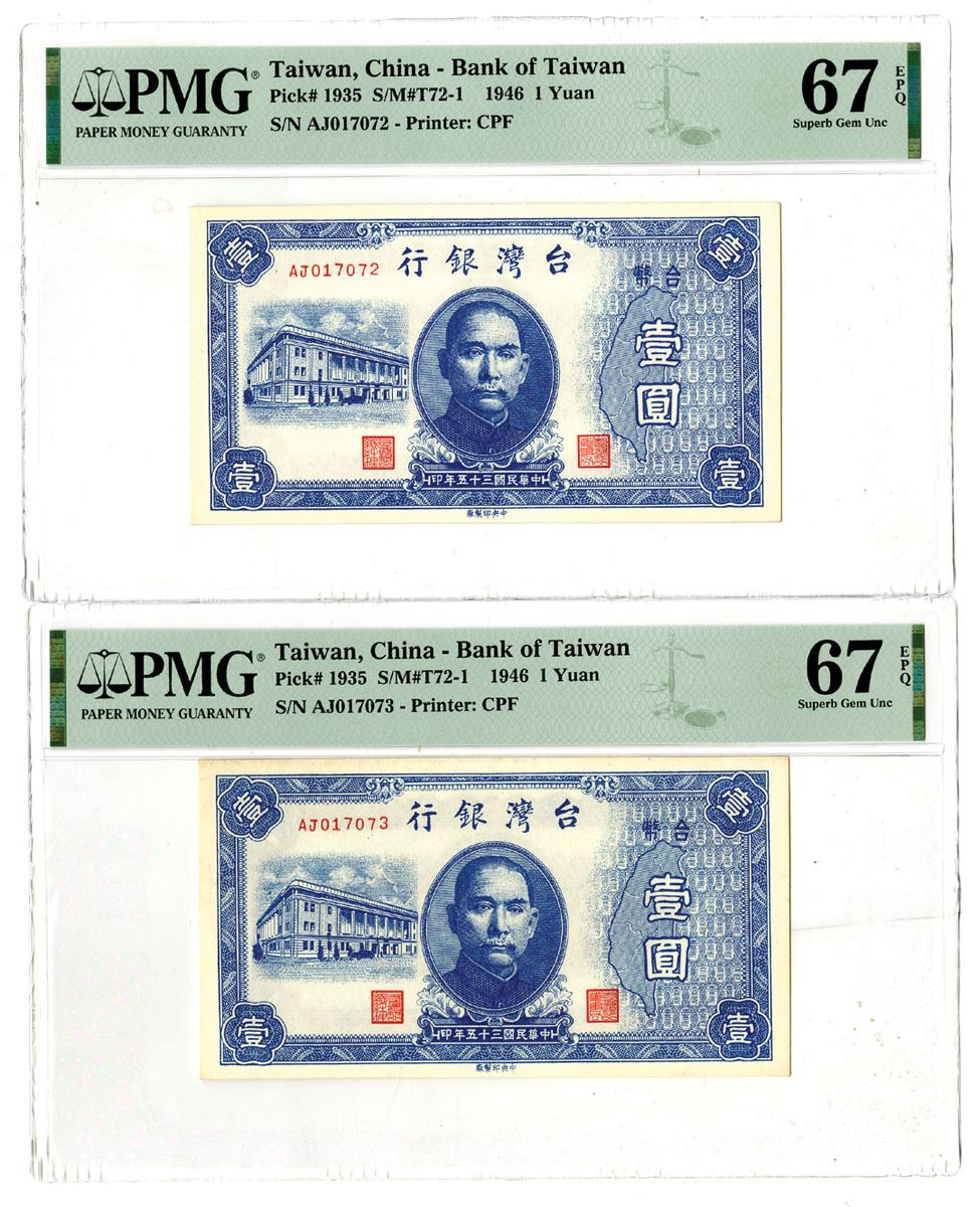 Taiwan, 1946. 1 Yuan, P-1935 S/M#T72-1, Sequential Pair of Issued Banknotes, Blue print, Bank building at left with map of Taiwan at right and portrait of SYS at center, Back is dark blue and light blue with naval battle at center, S/Ns AJ017072 & AJ017073, Both are PMG graded Superb Gem Uncirculated 67 EPQ, CPF. (2). Sold "AS IS" no returns accepted.