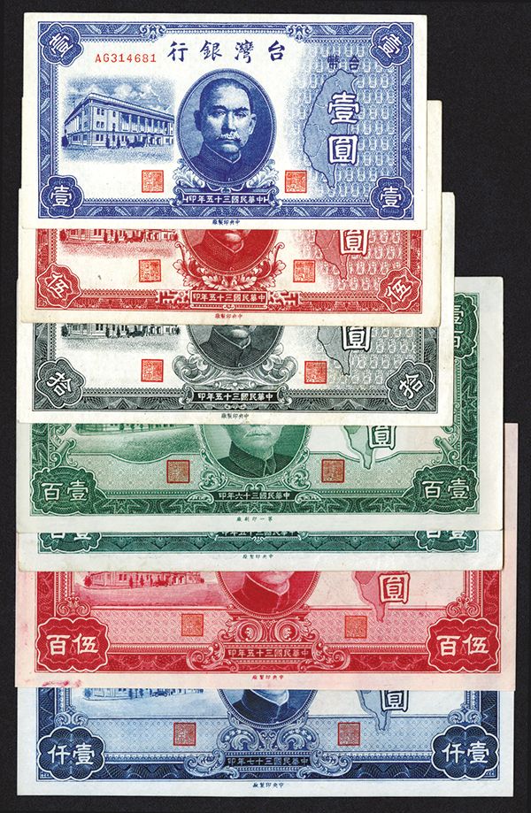 Taiwan, China. Lot of 7 notes, Includes 1946 Issues, 1 Yuan, 5 Yuan, 10 Yuan, 100 Yuan and 500 Yuan, P-1935 to P-1940 missing the 50 Yuan note; 1947-49 Issues, 100 Yuan, P-1941 and 1000 Yuan, P-1942, Condition ranges from XF to CU condition. Please inspect. Sold "As Is", no returns accepted.