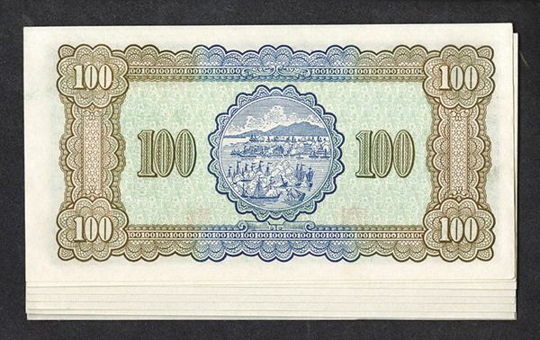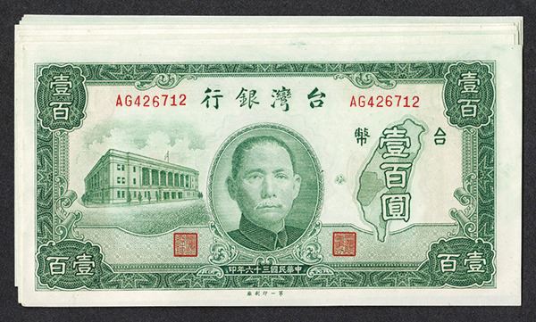 China - Taiwan. 100 Yuan. P-1941. S/M# T72-10. SYS at center, bank building without automobile in front at left, island map at right. All Choice Uncirculated and in serial # order. 8 pieces.